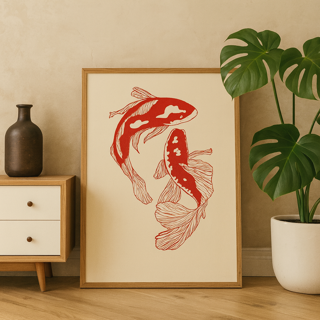 Le motif koi rouge mêle style abstrait et inspiration japonaise, idéal pour apporter une touche zen, moderne et sophistiquée à n’importe quelle pièce (salon, chambre, bureau…).