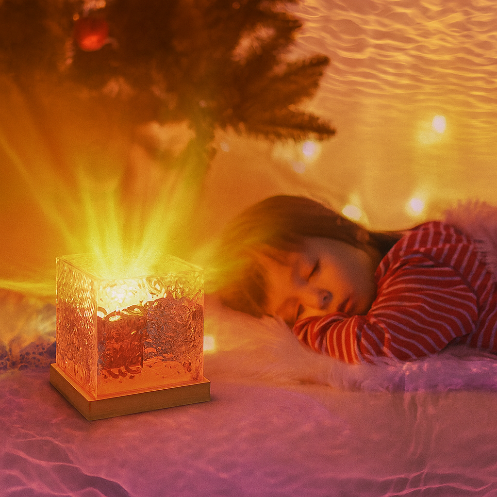La lampe utilise une lentille texturée et des LED puissantes pour projeter sur les murs et le plafond un effet d’eau en mouvement, plus un mode “aurore boréale”.